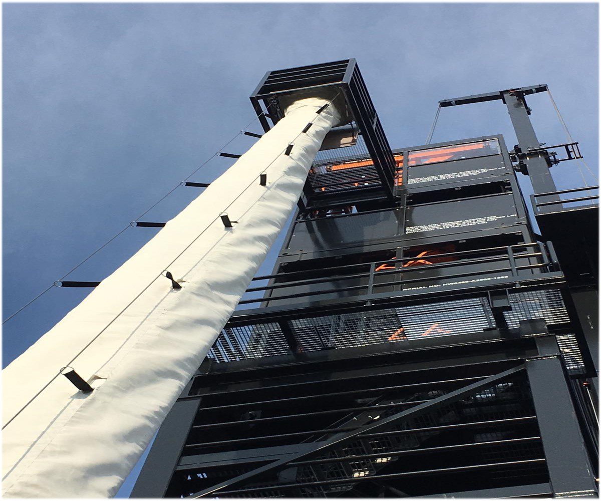 Tobogán helicoidal protegido por una manga textil ignífuga.