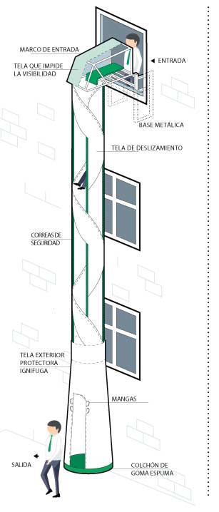 Salida de emergencia innovadora para evacuación rápida y segura en altura.